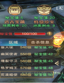 該BOSS玩法的進入副本后也是擁有100點秘寶值,也是該游戲魂器以及魂器材料產(chǎn)出的唯一途徑,激活魂器能給與角色很大的屬性加成,建議開啟該玩法后,每天都把次數(shù)刷完! 除BOSS以外,還有遠(yuǎn)古寶箱和特級珍寶可供玩家采集,但采集寶箱也同樣需要消耗秘寶值,詳情可見下圖。且該副本的BOSS挑戰(zhàn)難度較高,擊殺會比較耗時。(PS:按照物品掉落的稀有程度,優(yōu)先級可以分為:副本BOSS≥特級珍寶>遠(yuǎn)古寶箱)