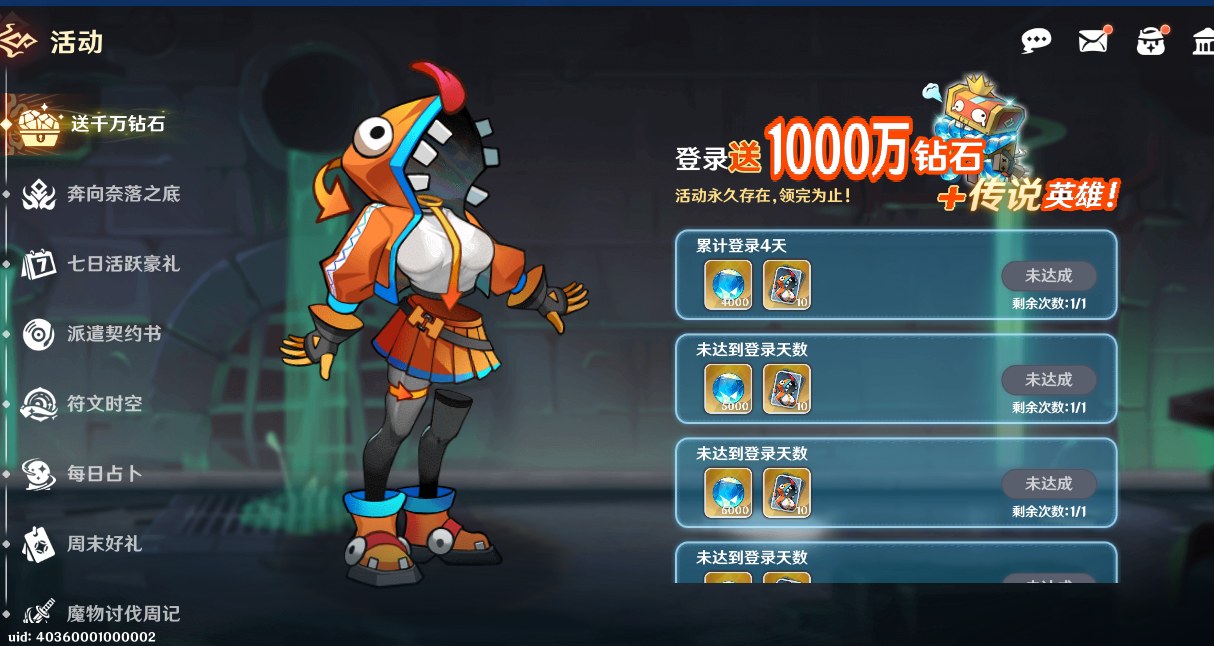 2、累計登錄送千萬鉆石以及傳說英雄更有七日活動送強力天才少女