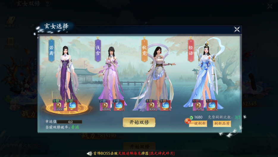 3、日常界面:玄女雙修,每天有兩次與玄女雙修機會和五次掠奪其他玩家,其中提升玄女品質可獲得更好的獎勵。
